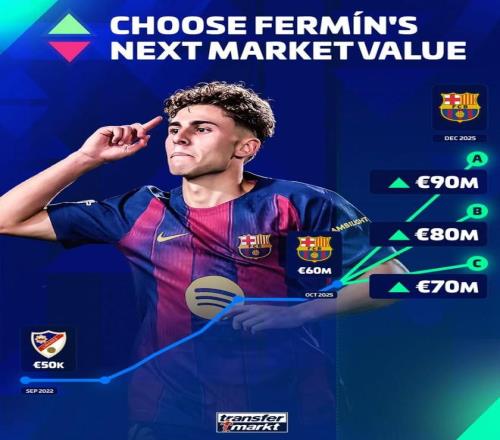 北京时间11月30日,德转预热了巴塞罗那中场球星费尔明-洛佩斯的身价更新,他们给出的三个选项全都为上涨,最高升至9000万欧元。