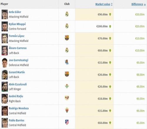 德转西甲身价涨幅榜:居莱尔上涨3000万欧,姆巴佩上涨2000万欧