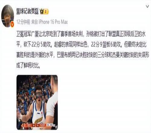 贾磊老师在社交平台写道:卫冕冠军广厦让北京吃到了赛季首场失利,孙铭徽打出了联盟真正顶级后卫的水平,砍下22分5助攻。赵睿的表现同样出色,22分9篮板6助攻。但最终决定比赛胜利的是外援的水平,巴里布朗两记决胜时刻的三分球和杰曼关键时刻的失误形成了鲜明对比。